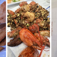 Shrimp, chicken, roast pork, beef and lobster with mixed vegetables sauteed with house special brown sauce. With rice.